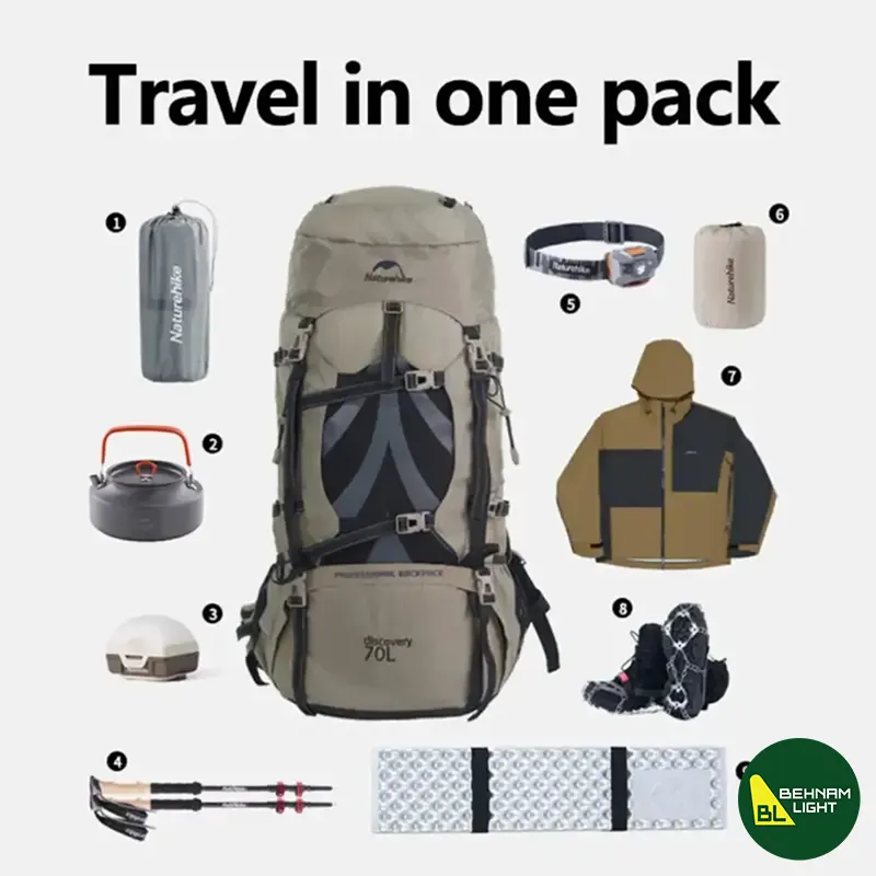 کولهپشتی 70 لیتر نیچرهایک مدل NH70B070-B با بدنه نایلون و پلیاستر، کاور ضد آب، شاسی آلومینیومی قابل تنظیم، سیستم تهویه 3D Air Flow و 5 جیب خارجی مناسب کوهنوردی و سفر
