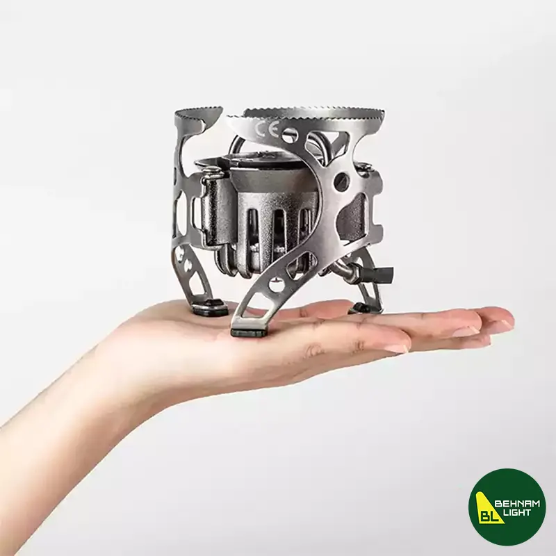 اجاق چندسوخت بی آر اس مدل BRS-8 با توان 4500 وات، قابل استفاده با گاز، بنزین، گازوئیل، نفت و الکل، وزن 547 گرم، ابعاد جمعشده 93×92 میلیمتر و دارای پیچ تنظیم شعله