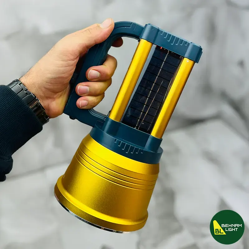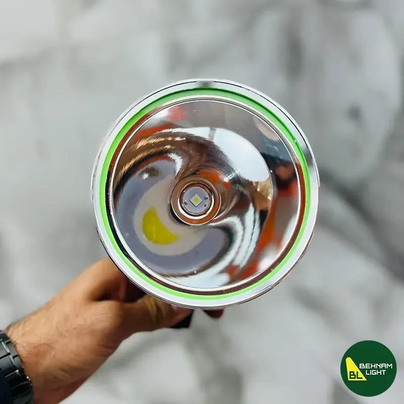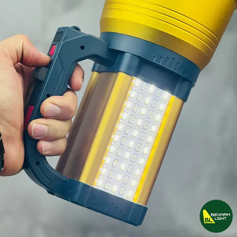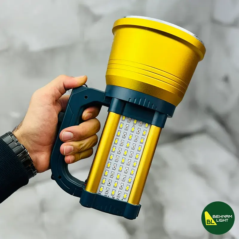 نورافکن اسمال سان مدل ZY-S066 با قدرت روشنایی 3500 لومن، برد نور 750 متر، باتری 18000 میلیآمپر، قابلیت پاوربانک، مقاومت در برابر آب و حالتهای نوردهی متنوع مناسب کمپینگ، شکار و استفاده روزمره