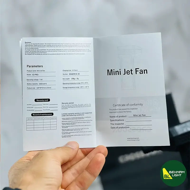 مینی جت فن کراسگان X3 PRO با ولتاژ 7.4 ولت، دو باتری 2900 میلیآمپری، شارژ 2 تا 3 ساعته، وزن 258 گرم و ابعاد جمعوجور، گزینهای کاربردی برای تمیزکاری و مصارف خانگی و صنعتی سبک است با کیفیت ساخت و عمر باتری خوب