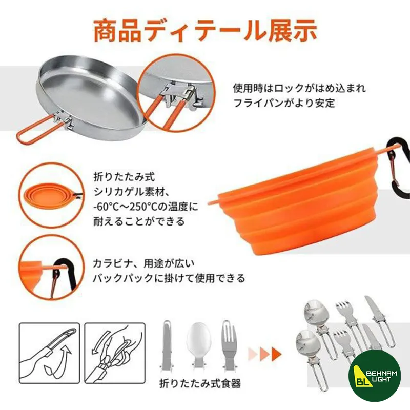 ست قابلمه کینگ کمپ مدل KA2209_SILVER اورجینال، شامل قابلمه 1.5 لیتری، ماهیتابه 0.5 لیتری، ظروف سیلیکونی، بشقاب و ست قاشق، چنگال و چاقو، جنس سیلیکون و فولاد ضد زنگ، سبک و جمعوجور، مناسب کمپینگ و سفر