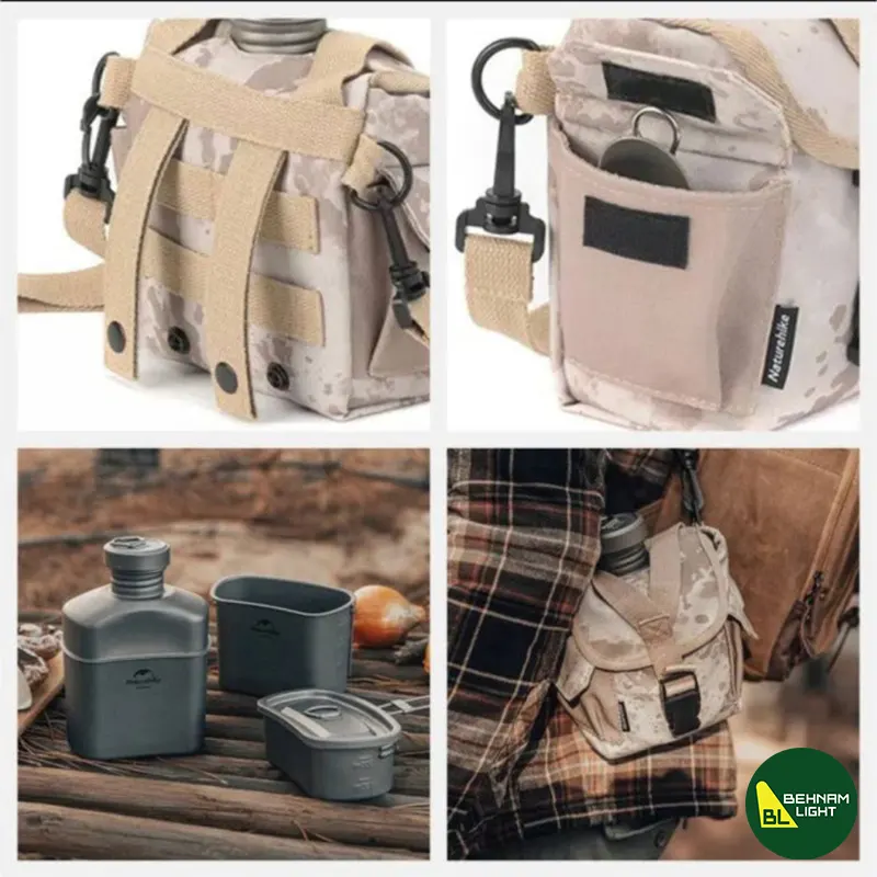 ست قمقمه و ظروف شخصی نیچرهایک مدل NH21CJ004 از جنس تیتانیوم سندبلاست است و شامل یک کتری، دو گلدان و درب قابلمه کوچک میباشد. این ست سبک و مقاوم با کیف بوم استتاری برای حمل آسان طراحی شده است.