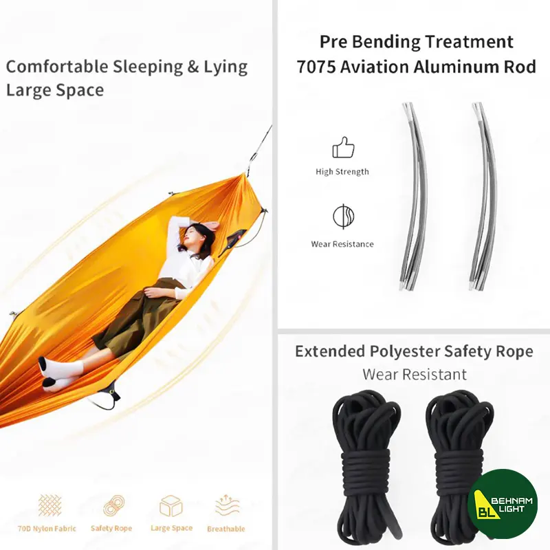 ننو DC-C05 نیچرهایک مدل NH22DC008 با وزن 900 گرم و ظرفیت تحمل وزن 200 کیلوگرم، مناسب برای 2 نفر است. این ننو دارای میلههای آلیاژ آلومینیوم 7075، سگک فولادی، و طناب پلیاستر مقاوم است