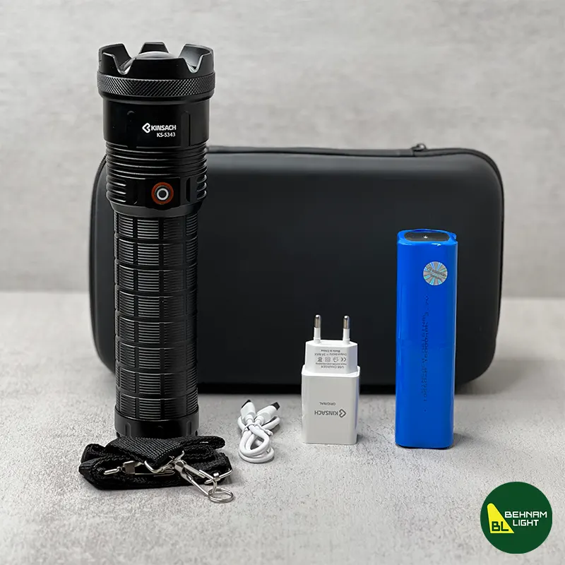 چراغ قوه کینساچ مدل S343 با قدرت روشنایی 5000 لومن، برد نور 1000 متر، باتری 16000 میلیآمپر و شارژدهی 10 تا 15 ساعت. دارای قابلیت ضد آب و ضد ضربه، مناسب برای نگهبانی، شکار، کشاورزی و کوهنوردی. همراه با بند حمل و جعبه هاردکیس