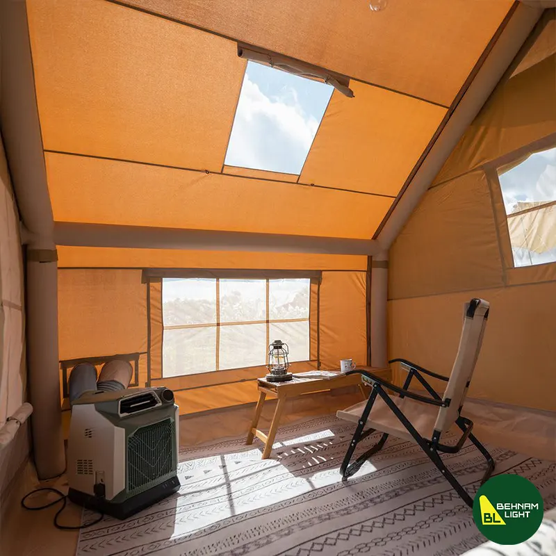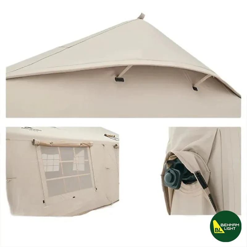 از اسمش هم معلومه: چادر “بادی”! یعنی نیازی به نصب با میلههای فلزی پیچیده نیست. تنها کاری که باید بکنی اینه که با پمپ مخصوص (که داخل پک هست)، باد رو وارد ستونها کنی و تموم! در عرض چند دقیقه چادرت آمادهی استفادهست.
