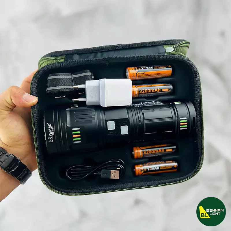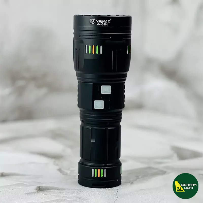 چراغ قوه یامو مدل YEMAO YM-G601 با بدنه مقاوم آلومینیومی، لامپ TG 3000M و TG60 LED، پنج حالت نوردهی، برد نور تا 1000 متر، مقاومت در برابر آب و سقوط، باتریهای 18650A با ظرفیت بالا، شارژ سریع Type-C و خروجی USB مناسب استفاده طولانی و شرایط اضطراری است