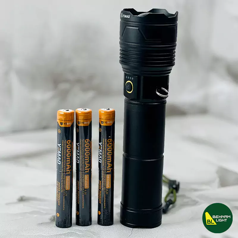 | سه باتری لیتیومی 181350A با ظرفیت بالا | چراغ قوه مجهز به سه باتری پرقدرت 181350A است که جمعاً ظرفیت 18000 میلیآمپر دارند. این باتریها طول عمر بالا و توان ذخیره انرژی زیاد را برای استفاده طولانیمدت تضمین میکنند |