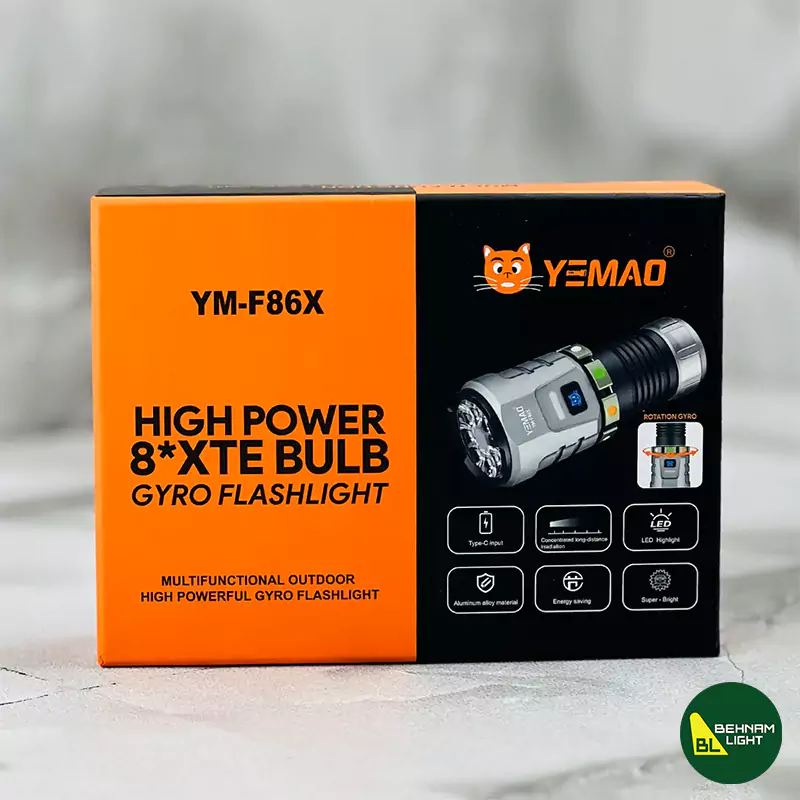 چراغ قوه YEMAO YM-F86X با لامپ پرقدرت 8*XTE، ژیروسکوپ چرخشی، بدنه آلومینیومی مقاوم، شارژ Type-C و باتری قابل تعویض 2500/5000 میلیآمپر. نور متمرکز، ضد آب، صرفهجویی انرژی و آهنربای قوی برای ماجراجویی، کمپینگ و استفاده حرفهای