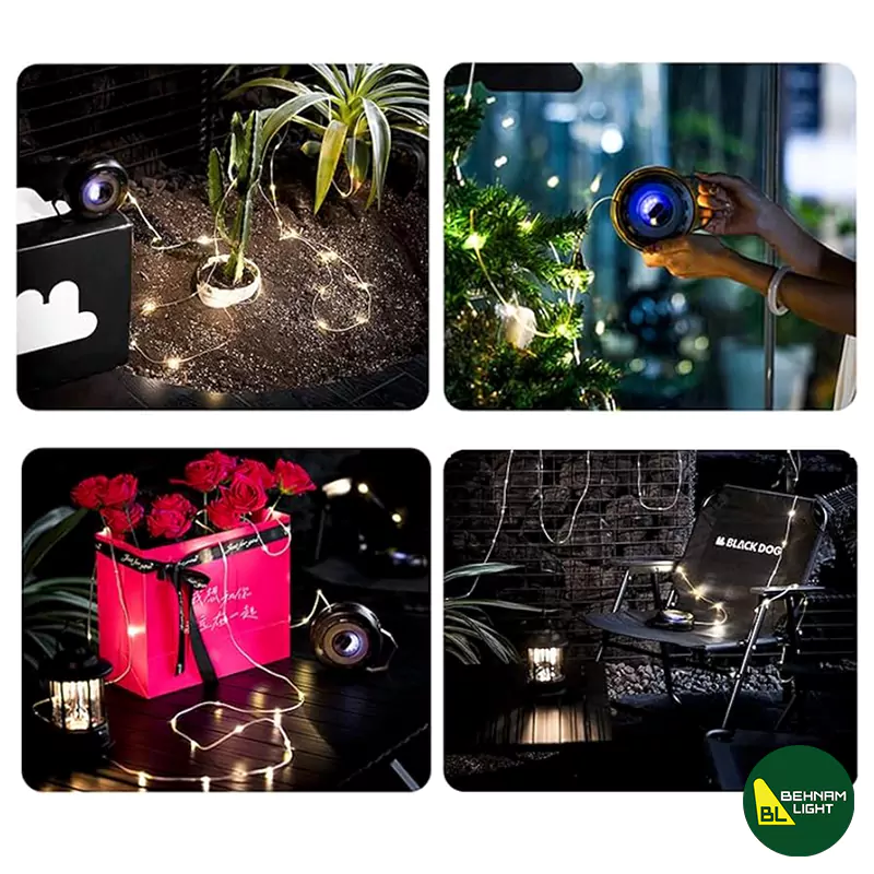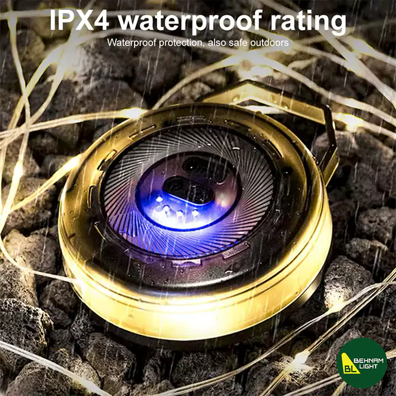 چراغ ریسهای 10 متری: یک ریسه LED به طول 10 متر که به دور بدنه اصلی پیچیده شده است. شما میتوانید این ریسه بلند را به دور سایبان، درختان اطراف، یا داخل چادر خود بکشید و یک نورپردازی وسیع، یکنواخت و بسیار زیبا ایجاد کنید.