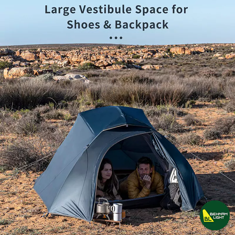 | ظرفیت | چادر دو نفره طراحی شده است و فضای کافی برای خواب راحت دو نفر بالغ فراهم میکند. همچنین فضای اضافی برای وسایل کوچک یا تجهیزات کمپینگ وجود دارد که برای زوجها یا دوستانی که سفرهای سبک میروند بسیار کاربردی است |