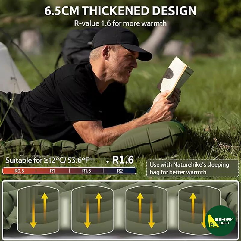 تشک راحت و ضخیم: یک بستر خواب با ضخامت 6.5 سانتیمتر که شما را از سرمای زمین دور نگه میدارد.