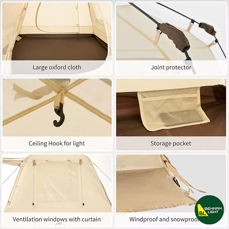 | تهویه | 2 درب + 2 پنجره + دریچه سقفی, وجود دربها و پنجرههای دو لایه (توری + پارچه) به همراه دریچههای سقفی باعث جریان هوای دائمی داخل چادر شده و از تعریق یا گرم شدن بیش از حد جلوگیری میکند |