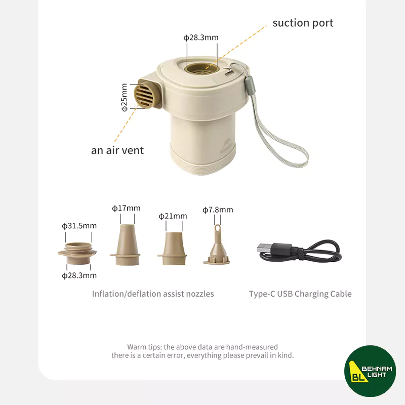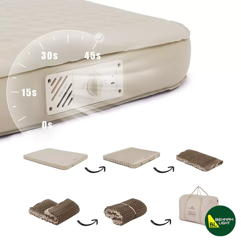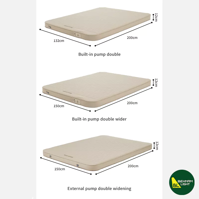 | قابلیت باد شدن سریع | با استفاده از پمپ دستی یا برقی (در صورت وجود یا تهیه جداگانه)، زیرانداز در مدت کوتاهی باد میشود. برخی نسخهها سوپاپ خودکار دارند که فرآیند بادگیری و تخلیه را سریعتر و آسانتر میکنند، در نتیجه زمان آمادهسازی کاهش مییابد |