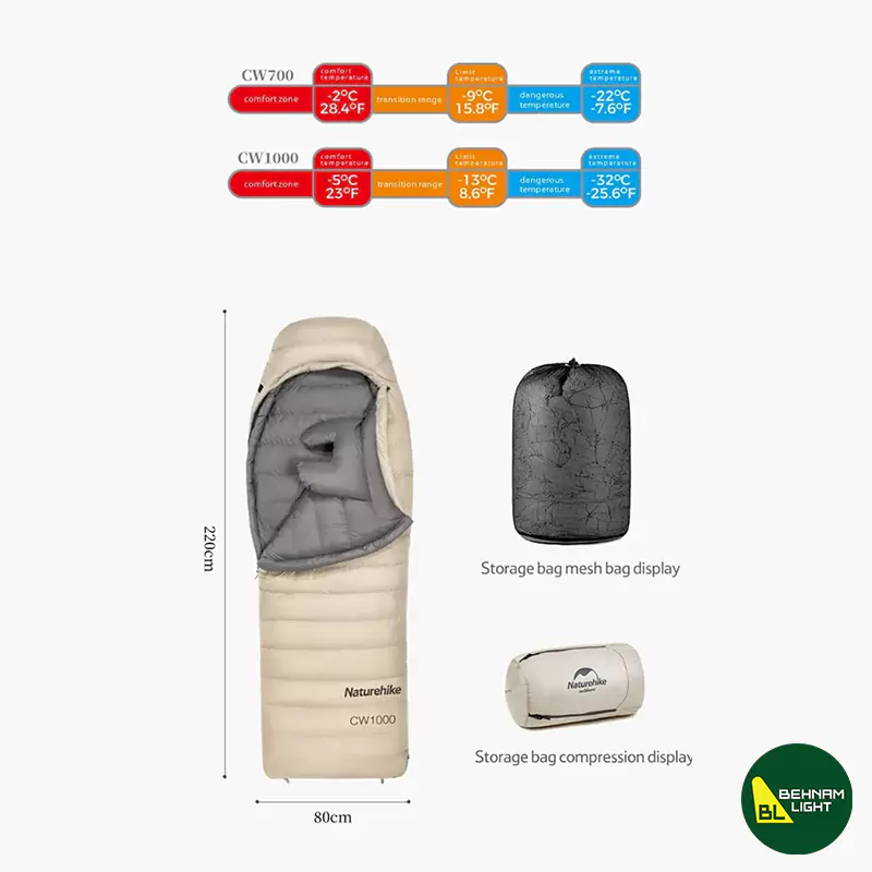 | مدل | CW1000 NH22YD002, این مدل از سری CW1000 نیچرهایک، کیسه خوابی حرفهای و مقاوم برای هوای بسیار سرد و ارتفاعات است. طراحی مومیایی و استفاده از پر غاز خاکستری با تراکم بالا، گرمای مطلوب و راحتی بالا را حتی در شرایط زمستانی سخت تضمین میکند |