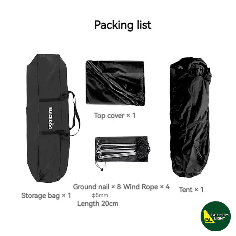 - اقلام همراه کامل : چادر شامل کیسه نگهداری، کاور باران، 8 میخ 20 سانتیمتری و 4 طناب مهار