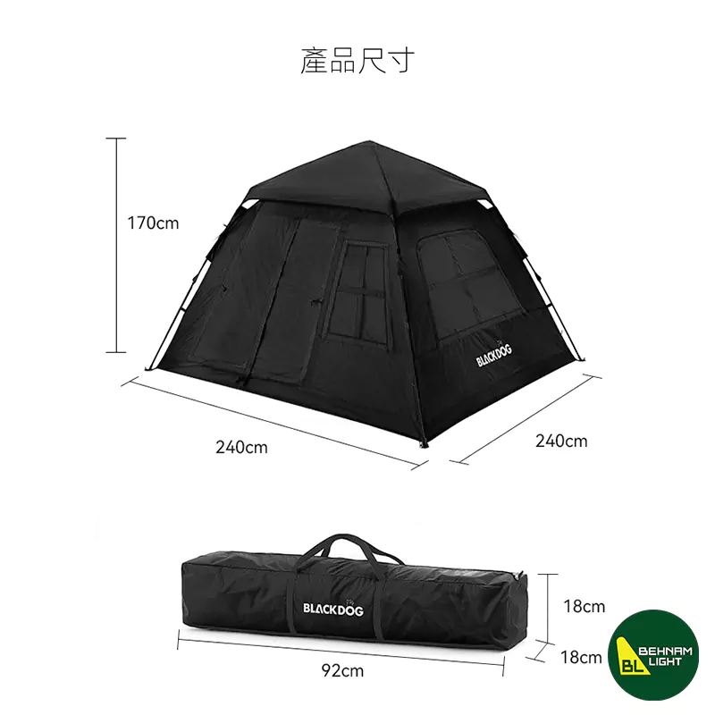 | ابعاد باز | 240×240×170 سانتیمتر, فضای کافی برای 3 تا 4 نفر ایجاد میکند و امکان خواب راحت، قرار دادن کیسهخواب و تجهیزات کمپینگ را به کاربران میدهد |