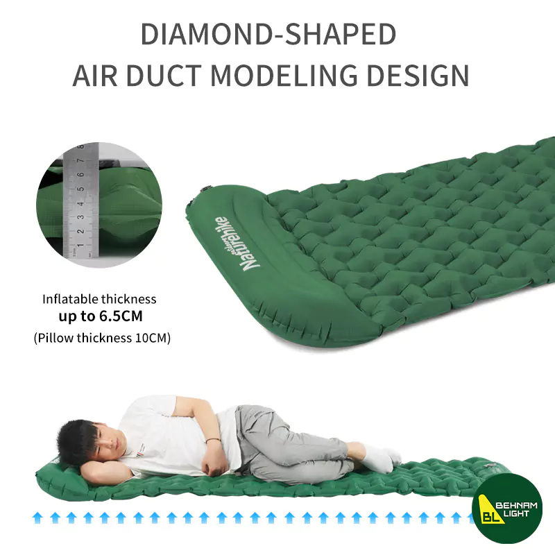 یکی از نوآوریهای برجسته در این مدل، حذف نیاز به تجهیزات جانبی برای آمادهسازی است. وجود یک پمپ فشاری داخلی به شما این امکان را میدهد که تنها با چند حرکت دست یا پا، این تجهیزات کمپینگ را به طور کامل باد کنید؛ این ویژگی در شرایطی که بر اثر سرما یا خستگی نای دمیدن در سوپاپ را ندارید، یک مزیت حیاتی محسوب میشود. همچنین، تعبیه یک بالش یکپارچه در قسمت فوقانی، نیاز به حمل بالشهای حجیم و اضافی را برطرف کرده و تکیهگاهی ارگونومیک برای گردن فراهم میآورد. سیستم تخلیه دو لایه نیز این اطمینان را میدهد که در زمان جمعآوری، هوای داخل آن با سرعت و به طور کامل تخلیه شده و به راحتی در کاور مخصوص خود جای گیرد.