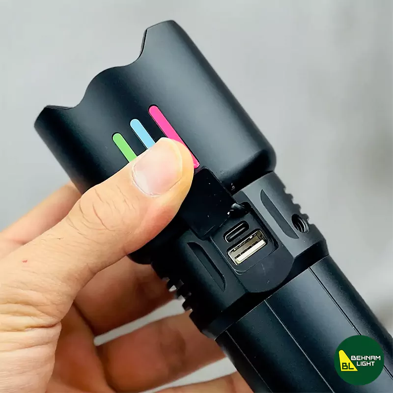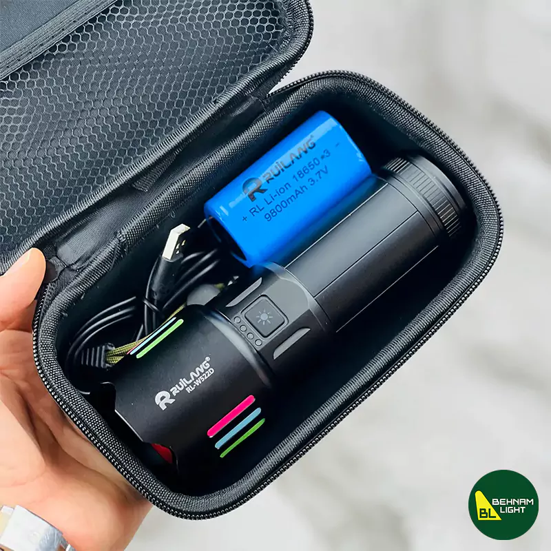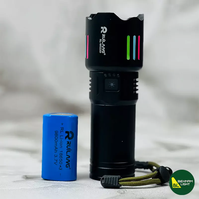 چراغ قوه رویلانگ مدل RL-W522D با باتری 9800 میلیآمپر ساعت، نور سفید پرقدرت 3000 لومن، برد 300 تا 400 متر و قابلیت زوم، مناسب برای کمپینگ، طبیعتگردی و استفاده روزمره