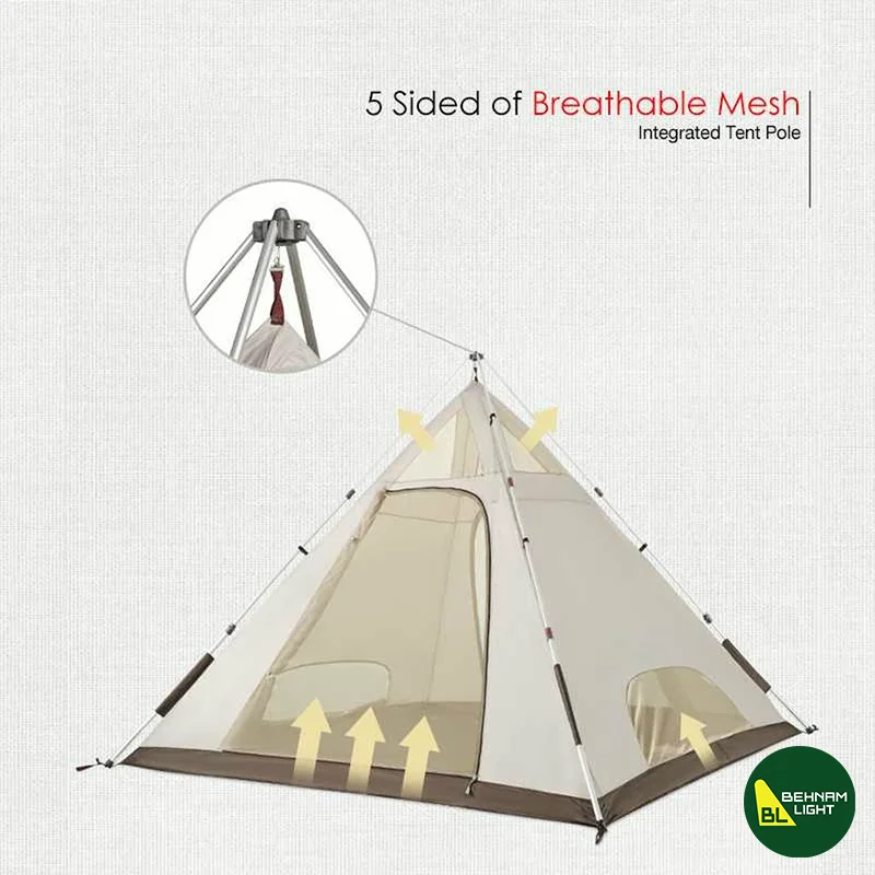 نکته دیگری که در خصوص چادر اتوماتیک هرمی چهار طرفه باید بدانید، سیستم تهویه آن است. این چادر به طور معمول دارای چندین پنجره و دریچه تهویه است که جریان هوا را در داخل چادر حفظ میکند و از ایجاد رطوبت و بخار در داخل آن جلوگیری میکند.