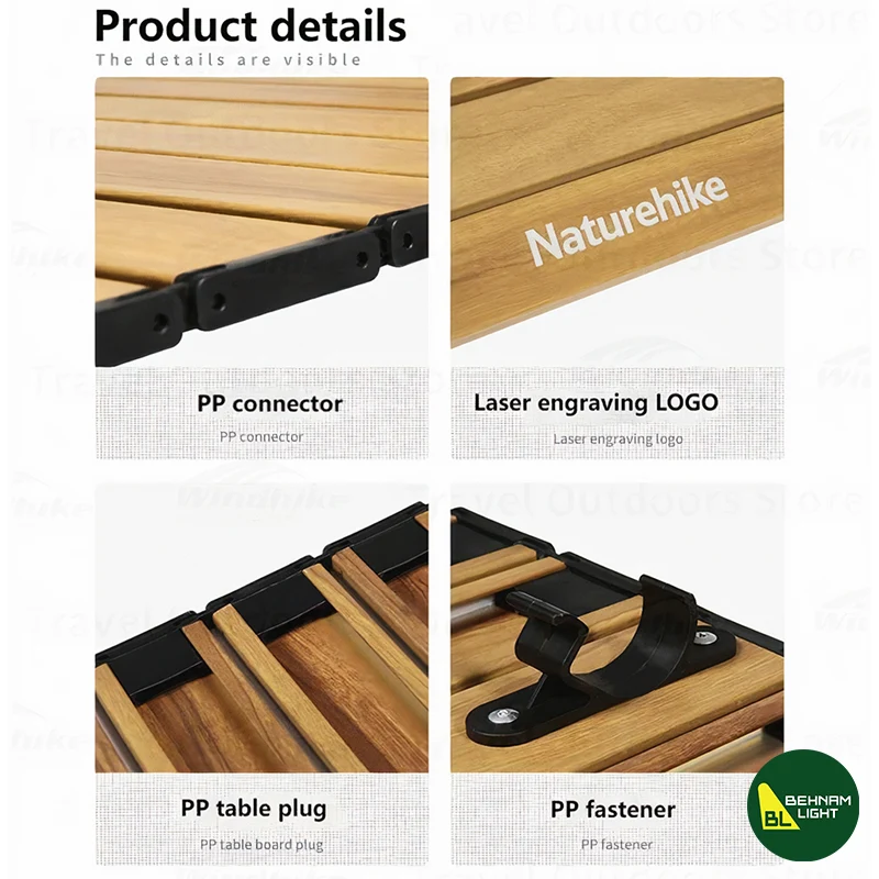 رویه میز آلومینیومی نیچرهایک مدل CNH22JU036 اورجینال، ساختهشده از آلیاژ آلومینیوم 6063 با طرح چوب، دارای قفل ایمنی و کانکتور تاشو PP، سبک، مقاوم و قابل نصب روی تخت XJC03
