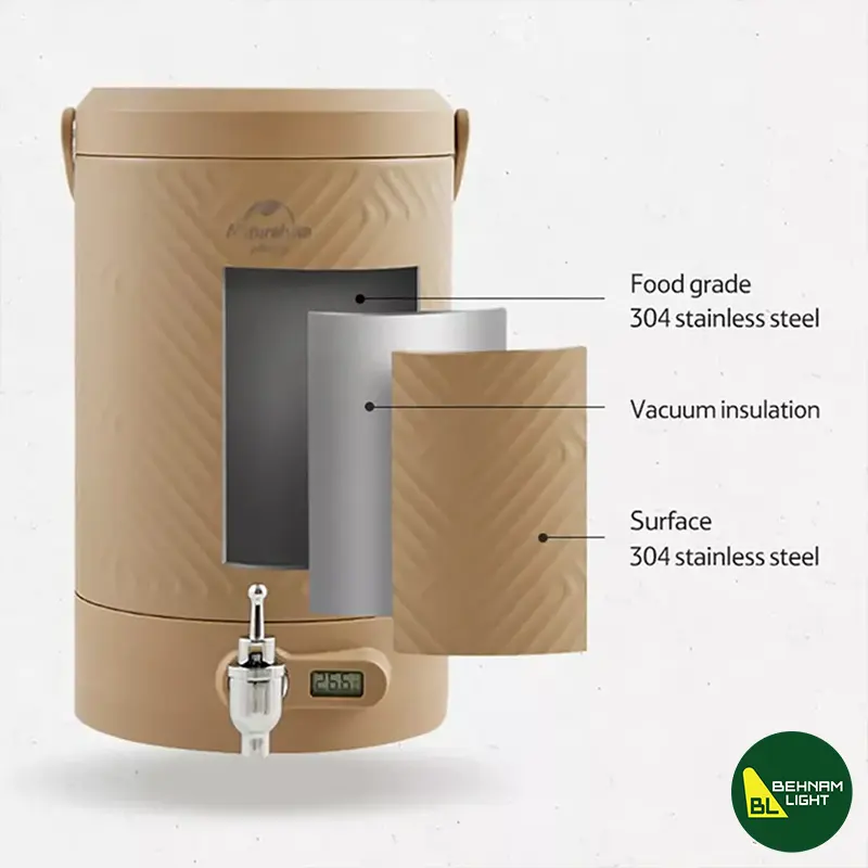 کلمن آب نیچرهایک مدل NH22SJ002 با ظرفیت 5 لیتر، وزن 2.9 کیلوگرم و اندازه 26 × 20 × 47.5 سانتیمتر، جنس بدنه از فولاد ضد زنگ 304 و مواد پوشش درجه مواد غذایی PP. مناسب برای نگهداری آب در سفرهای کمپینگ و فضای باز