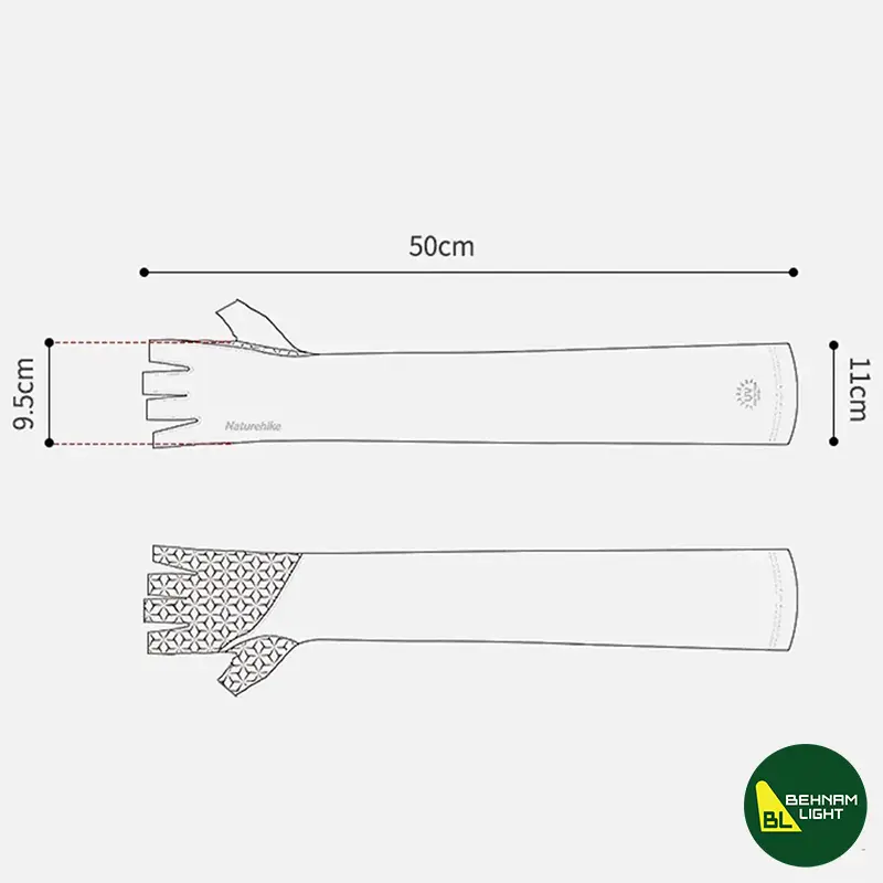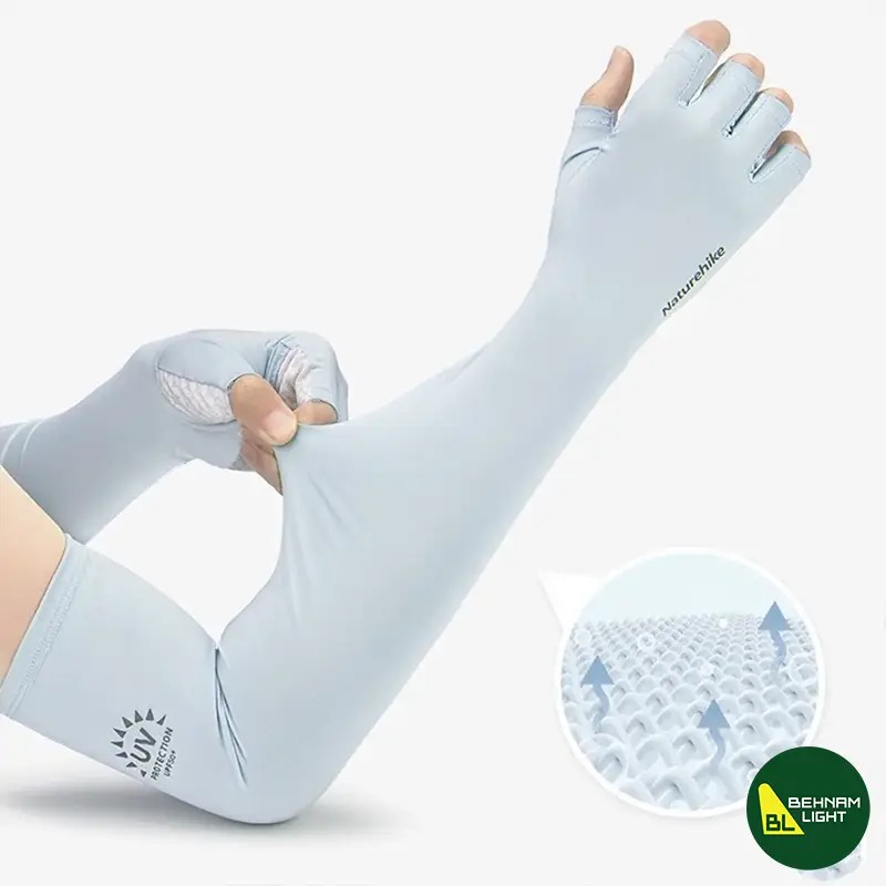 دستکش ساقدار نیچرهایک مدل NH21FS001، ساخته شده از جنس پلیآمید و اسپندکس، با وزن 50 گرم و طراحی راحت و کشسان. مناسب برای محافظت از دستها در برابر آفتاب با رنگبندی آبی، خاکی و سفید. ابعاد گانگ هر انگشت 50 × 9.5 سانتیمتر و گانگ کامل 55 × 8.4 سانتیمتر. قابل کشش از 24 تا 36 سانتیمتر