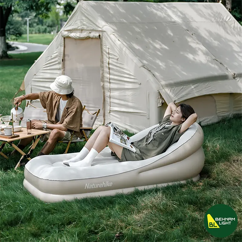 مبل بادی دو نفره نیچرهایک مدل CNK2300DZ020 با وزن 4.45 کیلوگرم و تحمل وزن 300 کیلوگرم. آمادهسازی سریع در 2 دقیقه. ابعاد 180 × 132 × 60 سانتیمتر با جنس PVC (کنار و زیر) و مخمل (رویه). مناسب برای کمپینگ و سفرهای راحت