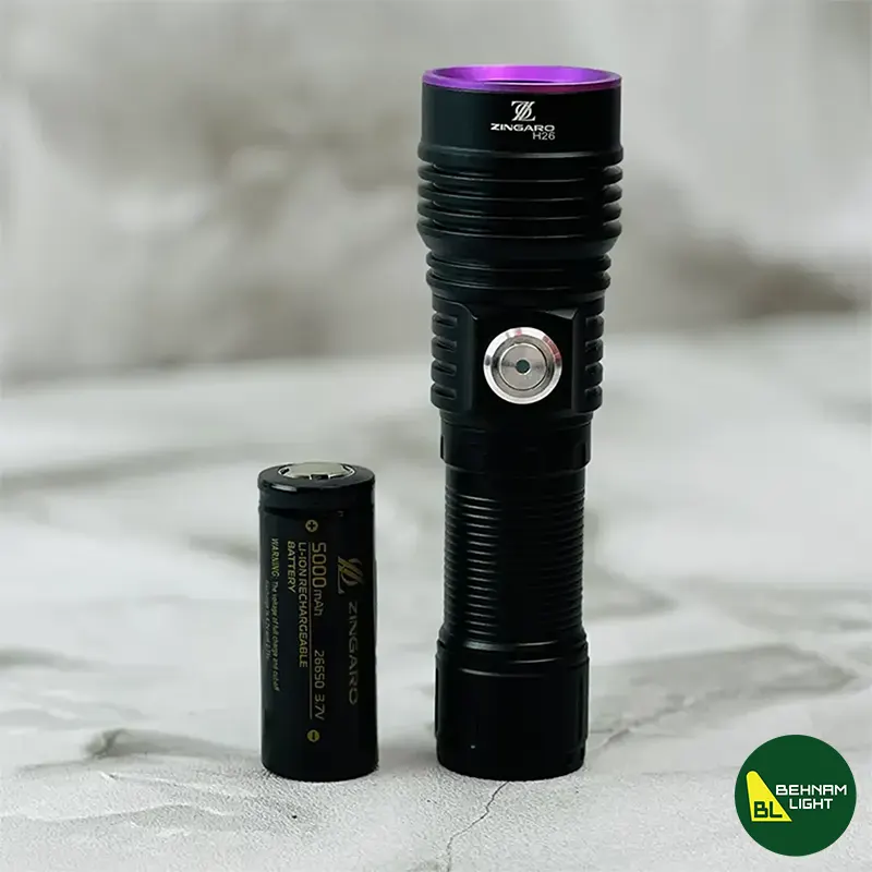 چراغ قوه یووی UV زینگارو مدل H26 با قدرت روشنایی 80 وات، برد نور 50 متر و باتری 5000 میلیآمپر، مناسب برای سفر، طبیعتگردی و شناسایی عقرب و اسکناس. دارای لامپ یووی (UV) و اقلام همراه شامل بند نگهدارنده و کابل Type-C