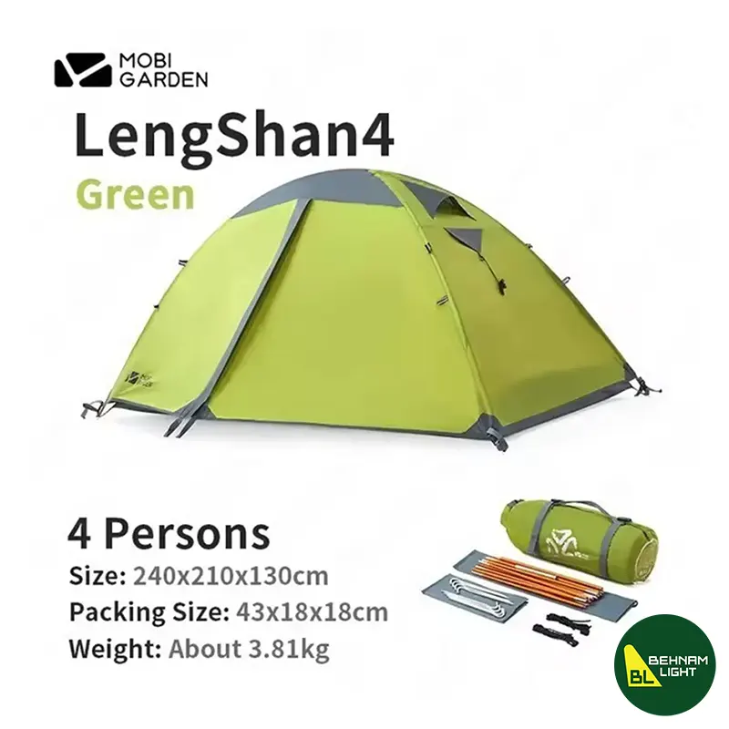 چادر چهار نفره موبی گاردن مدل Cold Mountain 4 با وزن 3550 گرم، ساختار دوپوش، ضدآب 2000/4000 میلیمتر، تیرکهای آلومینیوم 7001، تهویه مناسب و ابعاد 130×210×240؛ گزینهای ایدهآل برای کمپینگ و طبیعتگردی