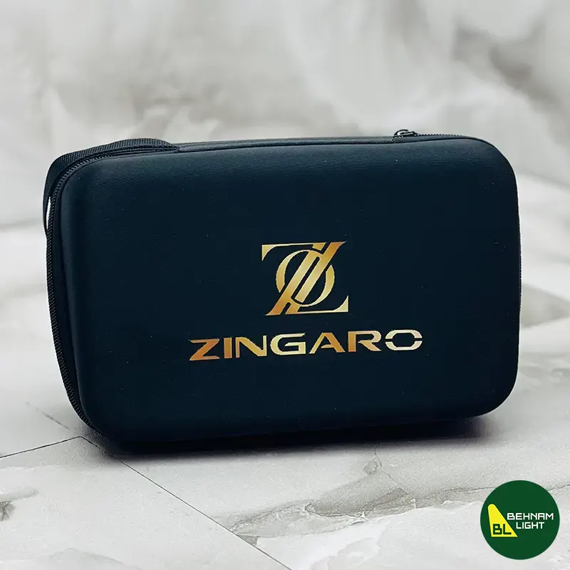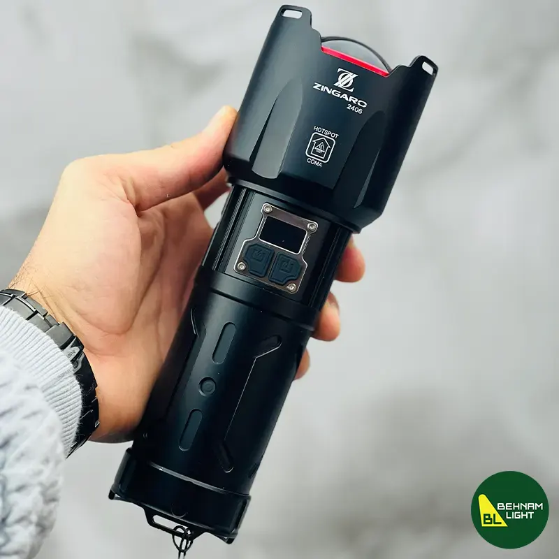 چراغ قوه دستی زینگارو مدل 2406 با نور مهتابی، برد تا 900 متر، روشنایی حداکثر 4500 لومن، باتری 3800 میلیآمپرساعت، قابلیت زوم، شارژدهی 4-6 ساعت و قابلیت پاوربانک — مناسب کمپینگ و فعالیتهای بیرونی