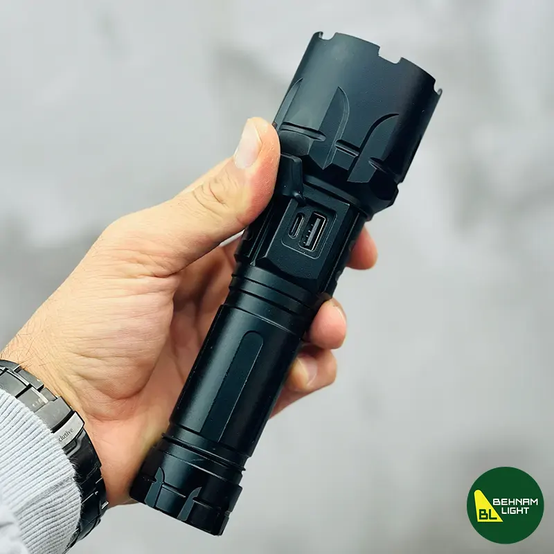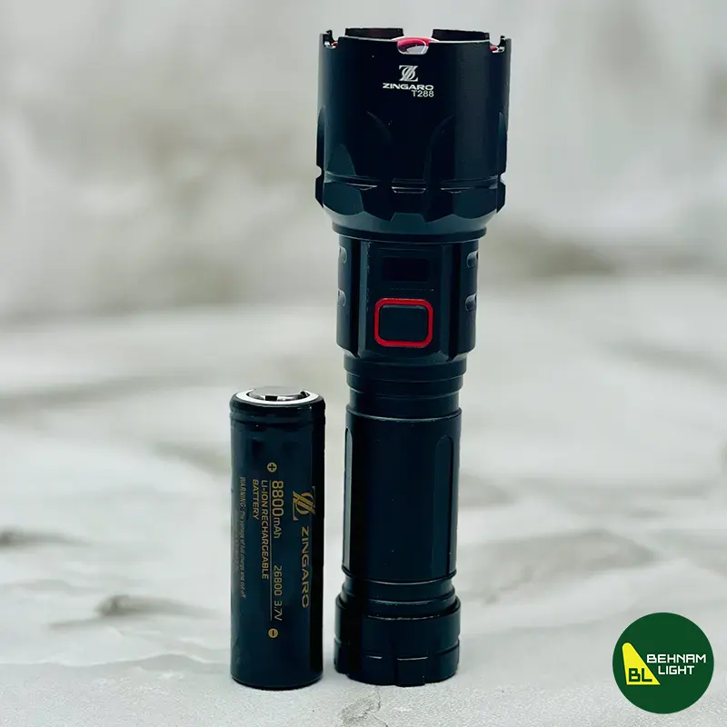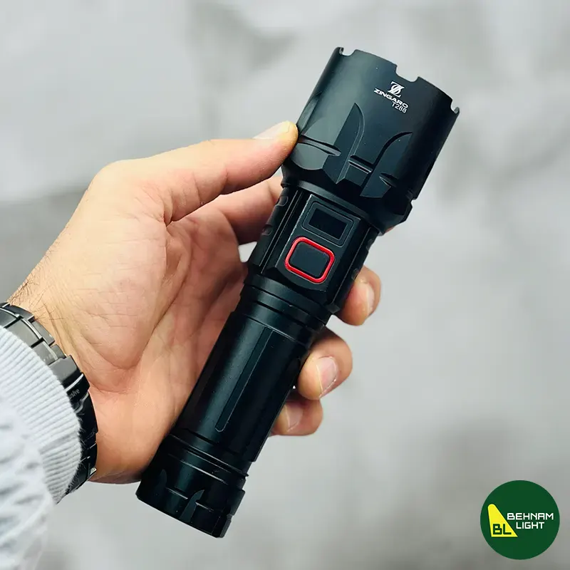چراغ قوه زینگارو مدل T288 با لامپ Laser LED، برد 400 متر، روشنایی 2000 لومن، باتری 8800 میلیآمپر، زومدار، سه حالت نوری، نشانگر شارژ دیجیتالی و شارژ Type-C؛ مناسب کمپ، شکار و طبیعتگردی