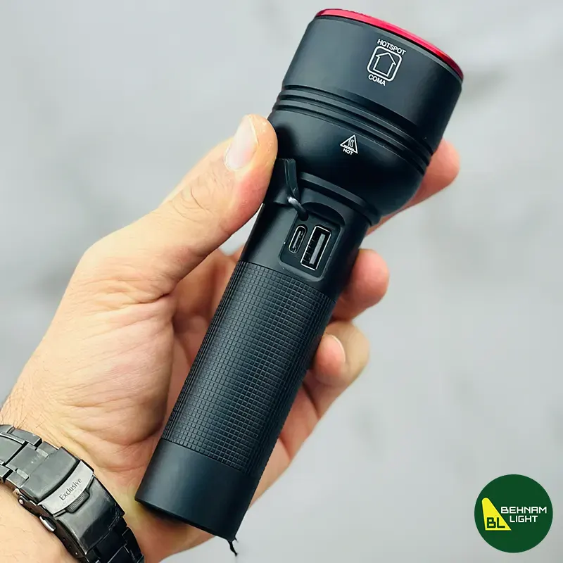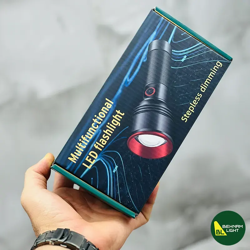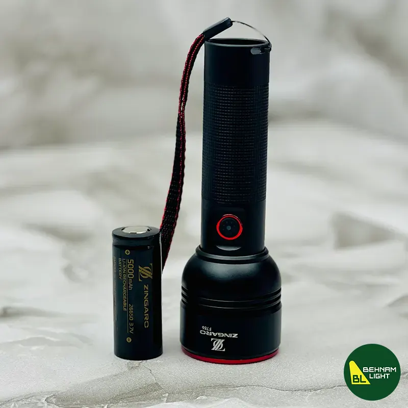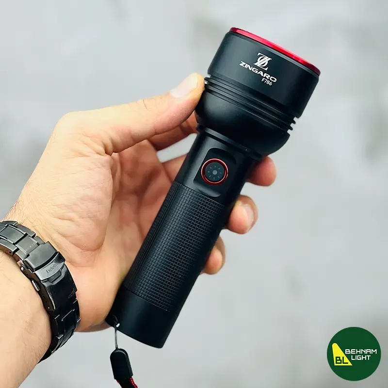 چراغ قوه زینگارو مدل F786 با روشنایی 3000 لومن، برد 700 متر، قابلیت زوم، باتری 26650 با ظرفیت 5000 میلیآمپر ساعت و سه حالت نوری. مناسب کمپینگ، کوهنوردی و استفاده روزمره