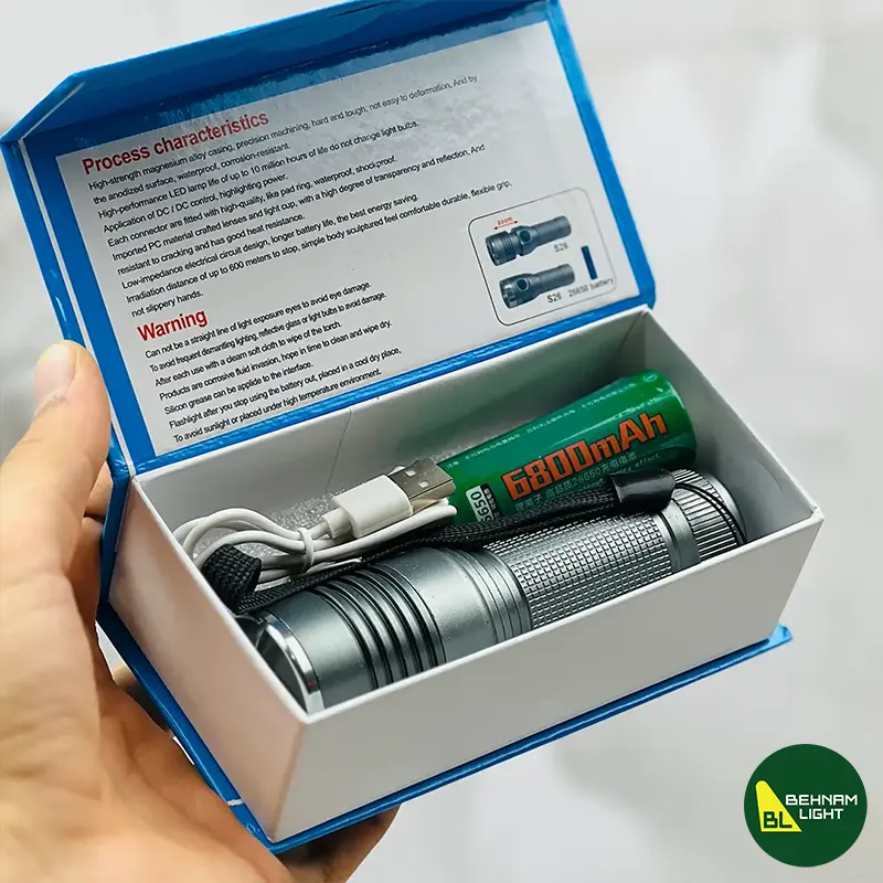 - اقلام همراه : باتری 26650، کابل شارژ Micro USB، آداپتور، بند، جاباتری نیم قلمی، تیوب تبدیل باتری 18650